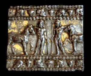 CAMPOCHIARO – Il dio del Santuario – Il santuario di Campochiaro è uno dei pochi luoghi di culto nel Sannio, o per lo meno nel territorio dei Pentri, di cui si possa indicare con certezza la divinità a cui era dedicato. Sappiamo che si tratta di Ercole come vari ritrovamenti mostrano; tra questi sono da segnalare un’antefissa che raffigura la lotta tra Ercole e il leone Nemeo, l’indicazione della divinità destinataria in una dedica osca su ceramica ed una statuetta in marmo di epoca più tarda. Espressiva, in questo senso, è anche l’attestazione della Tabula Peutingeriana che conserva il toponimo Herculis Rani in corrispondenza del sito del santuario.